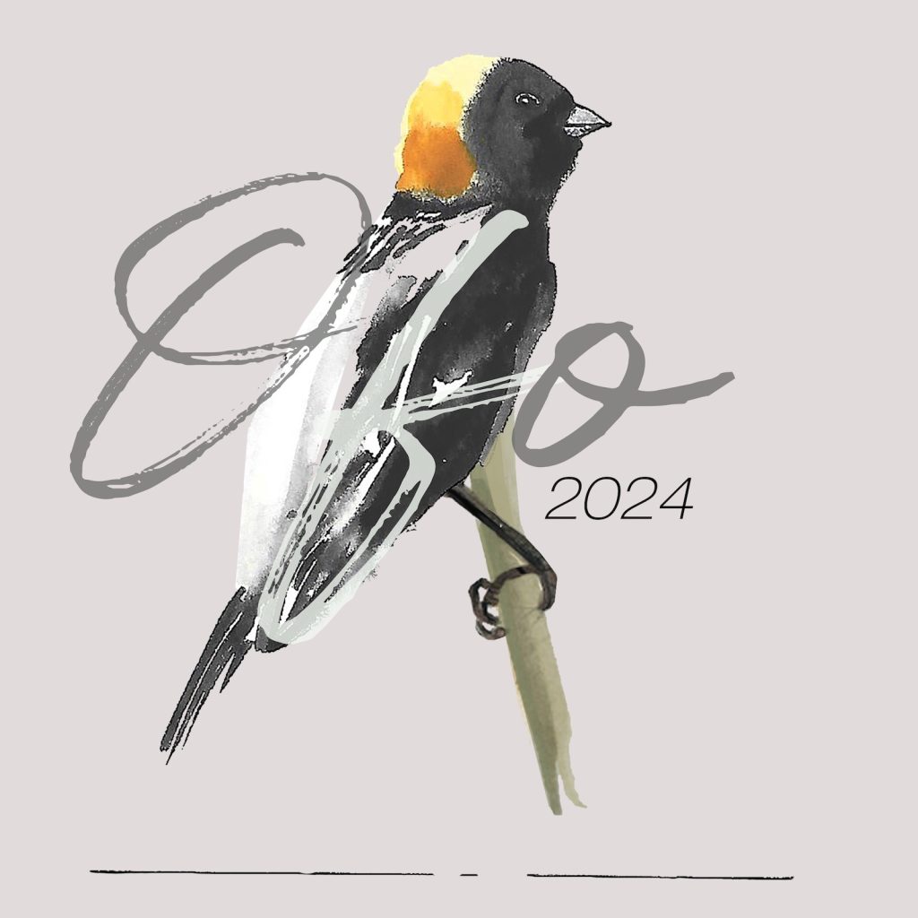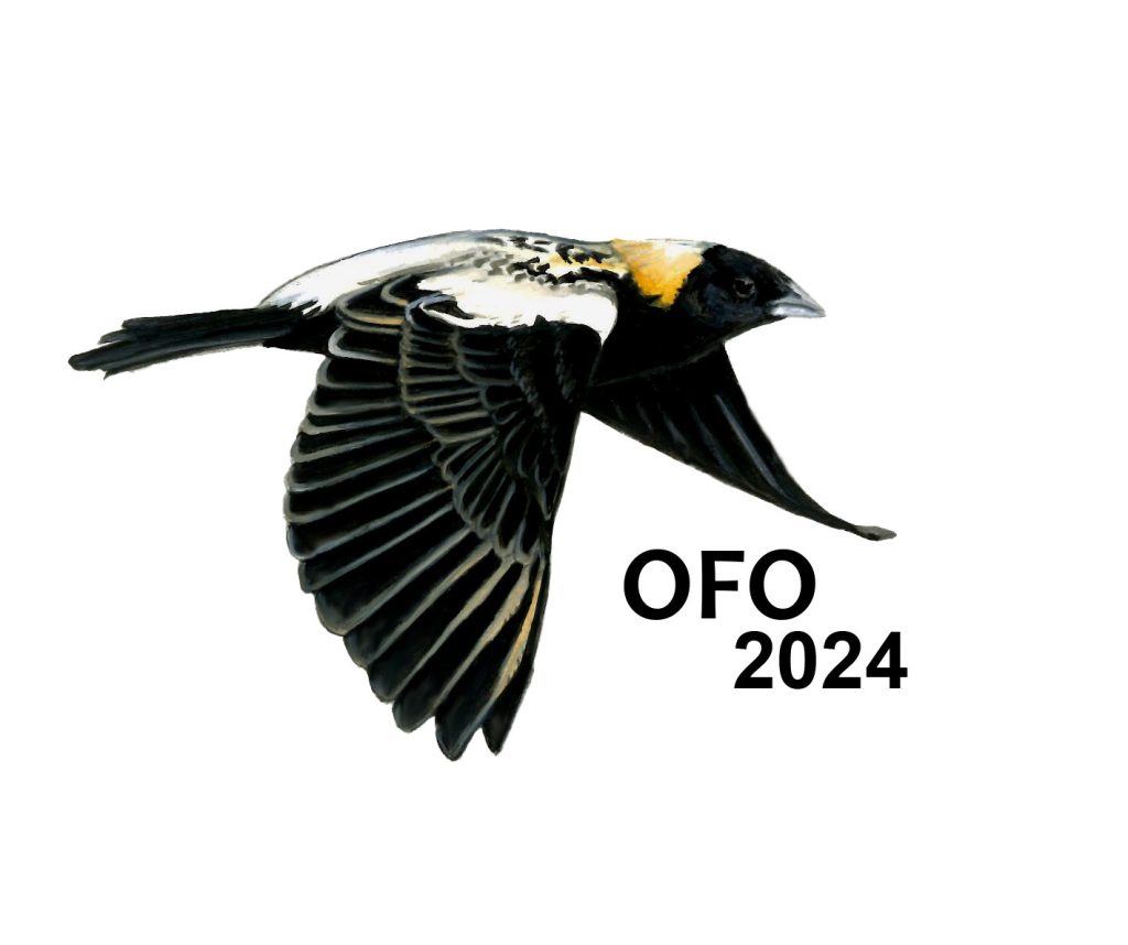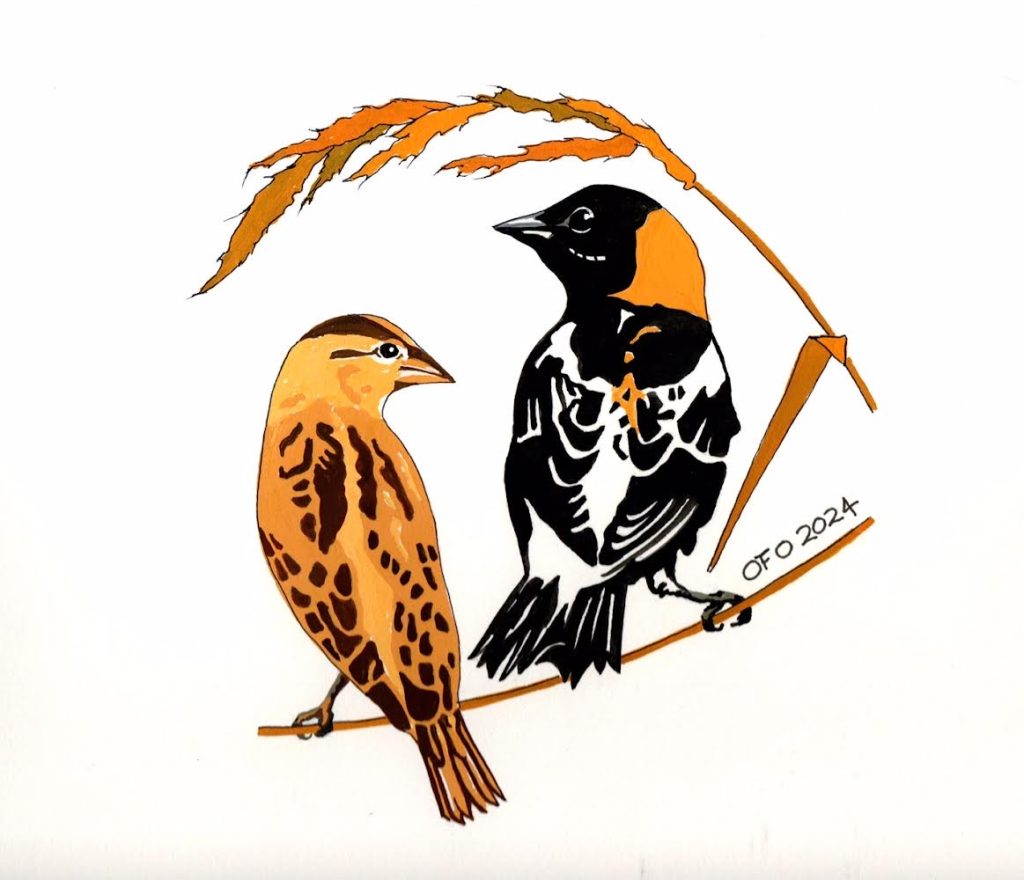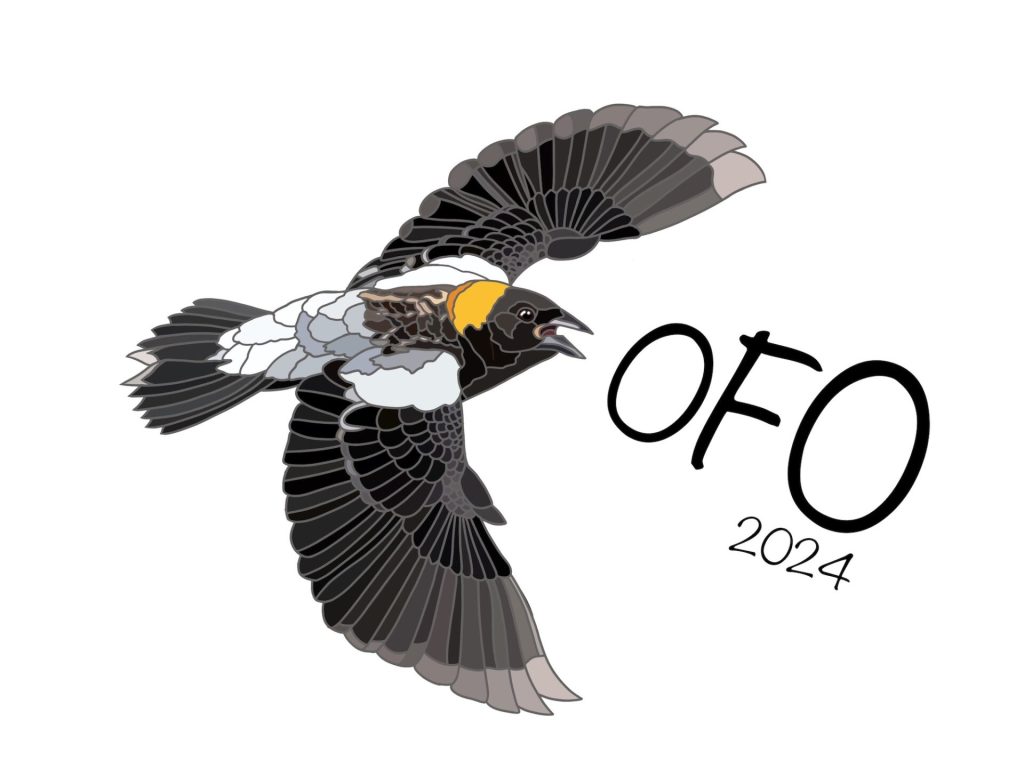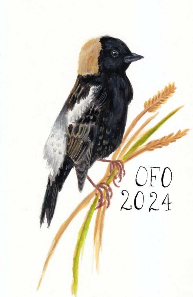 Alessandra Kite’s rendition of a flying male Bobolink gained the most votes from members, making it our first Bird of the Year logo! You can purchase it on a variety of items at the OFO Redbubble store